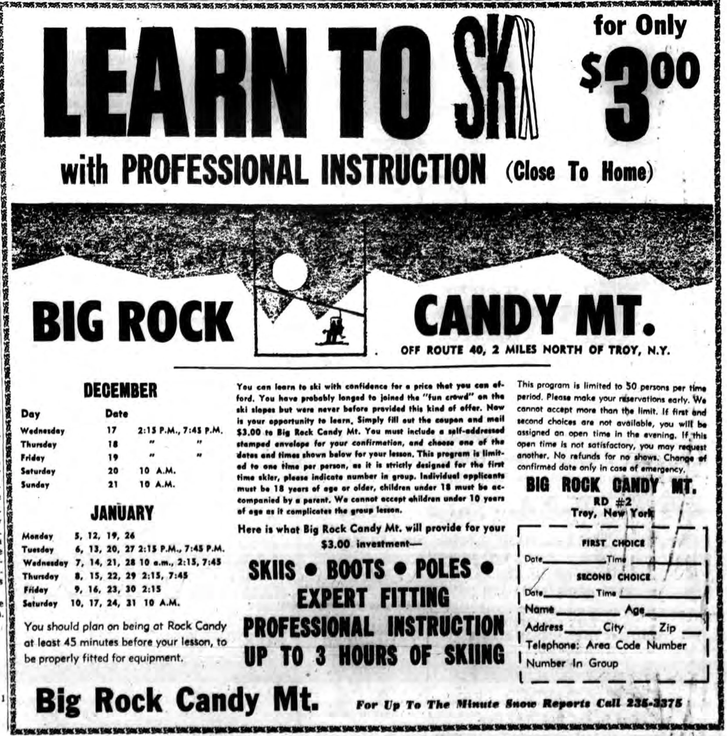"LEARN TO SKI WITH PROFESSIONAL INSTRUCTION (Close To Home) for Only $3.00 BIG ROCK CANDY MT. OFF ROUTE 40, 2 MILES NORTH OF TROY, N. Y." Times Record. December 13, 1969: 12 cols 4-8.