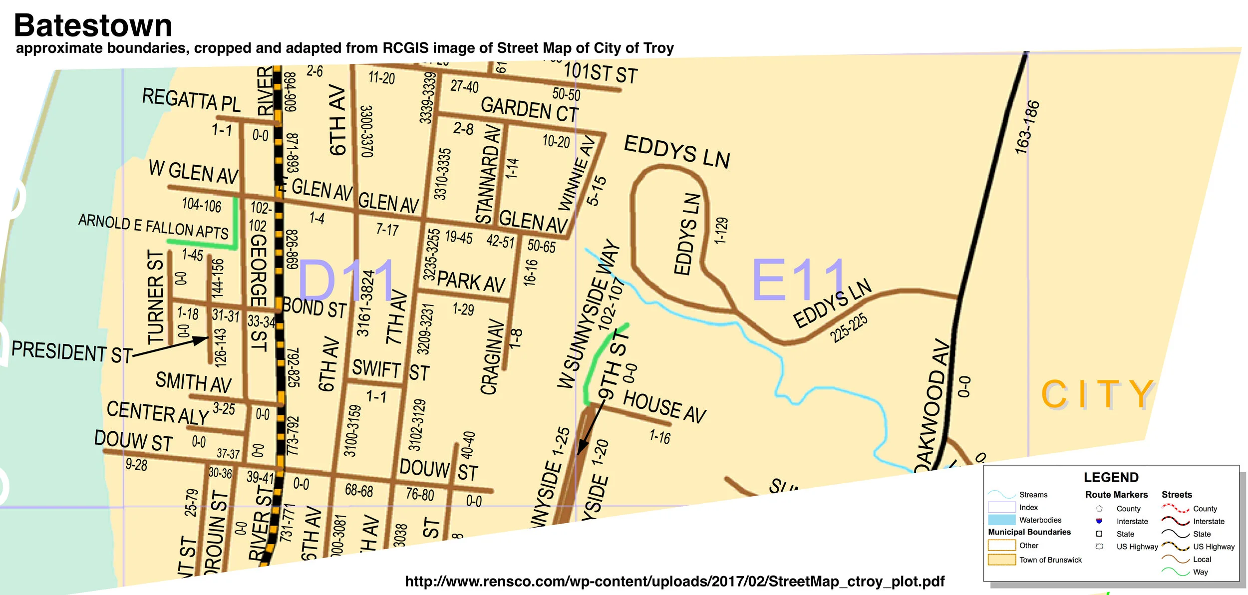 Batestown’s approximate boundaries, cropped and adapted from Rensselaer County Geographic Information Services image of Street Map of City of Troy