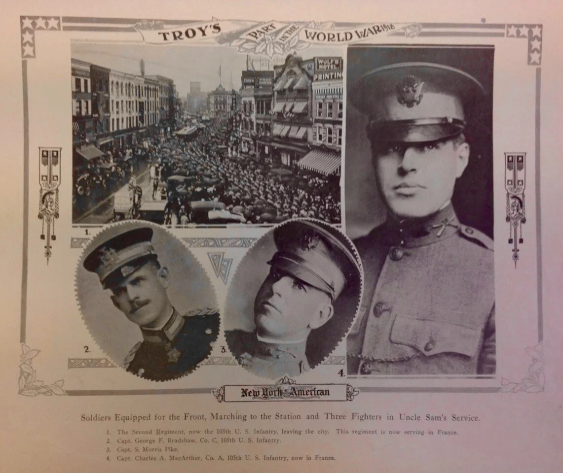 The publication Troy's Part in the World War 1918 didn't make note of which parts of Troy the people within it were from, such facts being - then and now - trivial in comparison to the work and sacrifice everyone made.One is nonetheless somewhat curious how many Burghers were involved. World War I began only about half a generation after Lansingburgh was annexed by Troy. In 1917 when the United States joined the war, with the exception of whatever few sixteen year olds might have enlisted, lifelong residents of "Upper Troy" enlisting (and of Schaghticoke south of the Deep Kill) would have been born in the Village or Town of Lansingburgh. At least one prominent Burgher is featured in Troy's Part in the World War 1918, but there could easily be others. There is a great deal of room for anyone to do helpful research in this area, and Lansingburgh's part in other wars post-1901 Troy annexation!