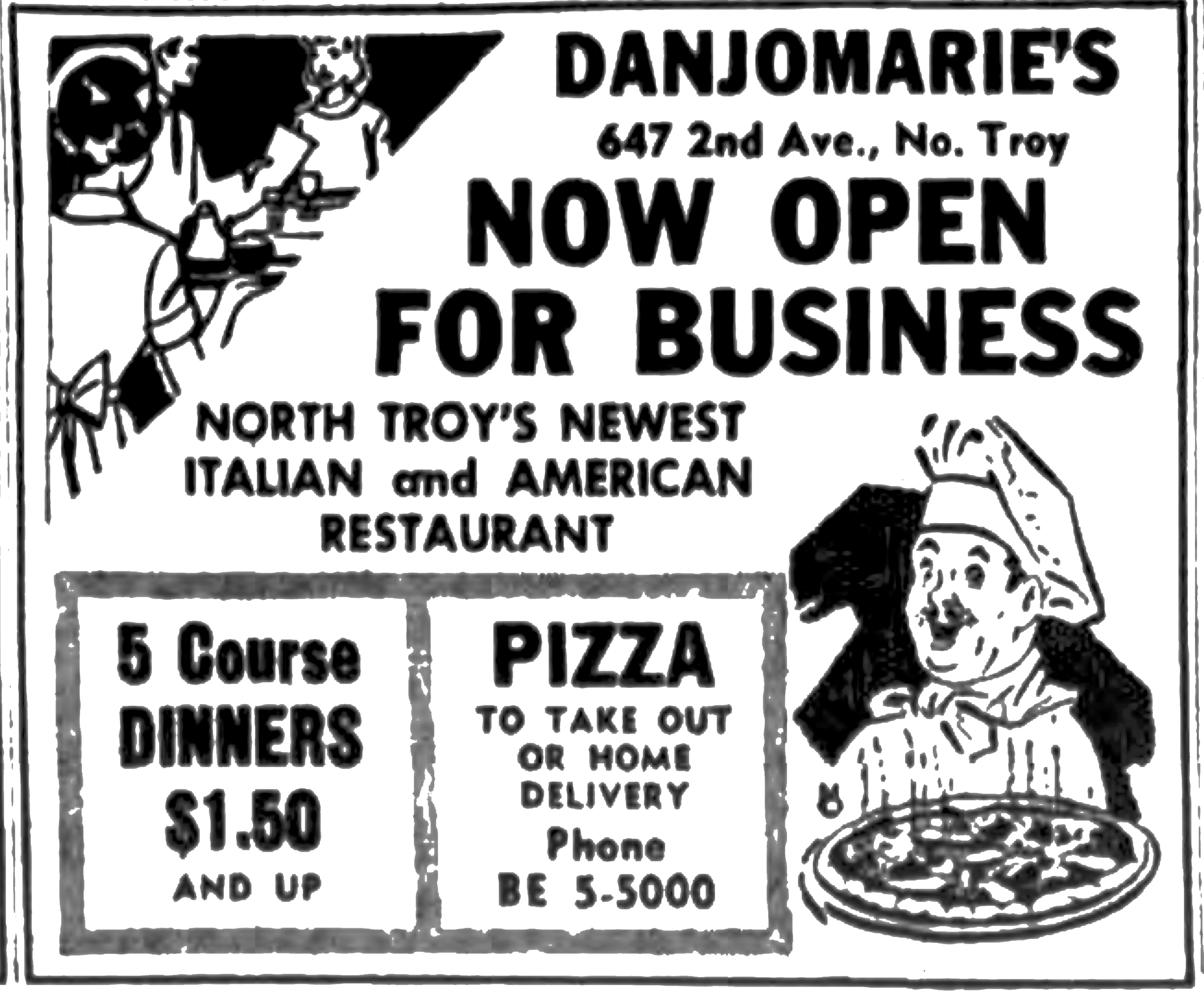 There may have been earlier venues to do so in Lansingburgh, and certainly within Troy. An April 8, 1949 issue of the Times Record, for example, had three different Troy restaurants advertising it on just one page: Jerry's Tavern at 55 Hill Street, a delivery place at 159 Second Street boasting the "best hygienic hot pizza," and Royal Pizza at 126 Jefferson Street.